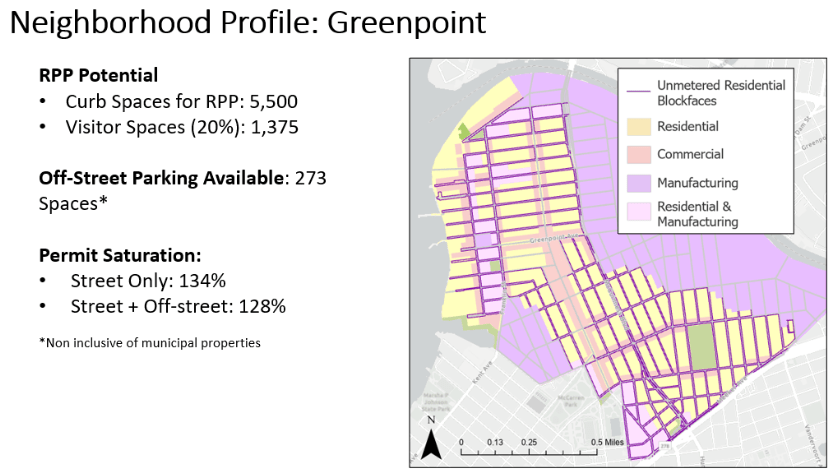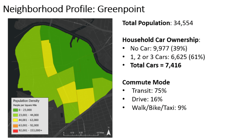 As a Parking Planner within NYC DOT’s Parking Planning & Policy Unit, in response to requests from electeds, I analyzed unmetered, residential blocks throughout NYC to estimate a space count for Residential Parking Permit potential. I used these to develop Neighborhood Parking Profiles for geographies throughout NYC, in order to understand the parking practices and needs of each. Ultimately, because the number of (registered) vehicles far exceeds the number of available spaces in each neighborhood, we could not recommend introducing a paid parking “hunting license.”